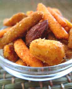 You don’t have to mainline the nuts: you can spice things up in lighter ways by tossing a few into a green salad, a chicken dish, or rice. We chopped some up and breaded chicken cutlets: the Jerk Nuts were terrific, the Hott Nuts were...hot, but hot food-lovers will love that recipe. Just don’t play tricks on anyone and pretend they’re normal barbecue nuts. It isn’t nice!