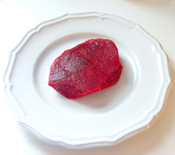 membrane like the fell of lamb loin which is easily removed prior to cooking. It is flawless meat with no marbling. The raw meat has a squab-like smell, and in fact, you cook bison the way you would cook squab breast, tuna or venison. If the tenderloin is 2.5" thick and you want it rare, you can split it in half horizontally and cook it for two minutes on each side over medium-high heat, which worked equally well for the strip steaks. We suggest pressing down on the cooking meat once or twice after flipping. To retain more juices and reduce the chance of overcooking, turn only once. Having the meat chilled (or even slightly frozen) when grilling will also help, since cold meat takes longer to cook.