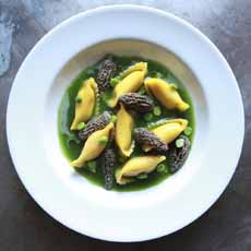 Cheese-stuffed mezzalune with morel mushrooms in a sauce and garnish of fresh green peas. Photo courtesy The Pines | NYC. |