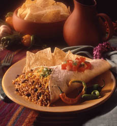 On the lighter side, this black bean and brown rice burrito would be approved by the USDA, which recommends three servings of fiber daily. One key benefit of healthy carbs, like brown rice and black beans, is that they contain fiber, which helps you to feel fuller, and slows down the absorption of carbohydrates. Brown rice is chewier, more nutty-tasting and flavorful than white rice. Besides the fiber found in the brown rice, the bran contains nutrients like magnesium, manganese and zinc. Plus, legumes, the class of vegetables that includes beans, peas and lentils, are a nutritional jackpot. Typically low in fat, cholesterol-free and are high in folate, potassium, iron and magnesium, burritos are a good source of protein (and a healthy substitute for meat, which has fat and cholesterol).