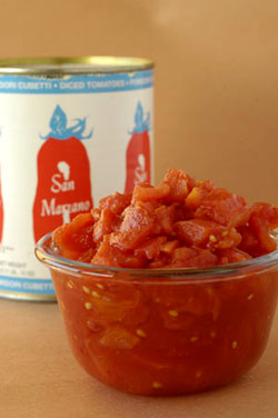 San Marzano tomatoes are sold crushed, diced and whole. In the Simpson (unbranded) product, the tomatoes are canned with salt, calcium chloride to keep the color bright and citric acid as a preservative. The liquid in each can is an exquisite tomato juice—don’t discard it, but enjoy it as a snack while you’re cooking. The cans are 28 ounces (1 pound, 12 ounces).