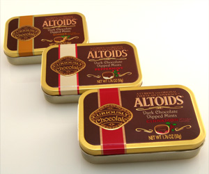Chocolate-Covered Altoids®. Yes, you heard it right. Wanting to diversify its chewing gum business, the Wm. Wrigley Jr. Co. tried unsuccessfully in 2002 to buy Hershey Co. for $12 billion. Last year it purchased the Altoids business from Kraft Foods for $1.4 billion. And last week, the world’s largest chewing gum company launched its first chocolate product—and an upscale product, at that. The company rolled out three flavors of Altoids mints covered in 50% cacao dark chocolate. Leveraging the “Curiously” theme used to promote Altoids, the new dark chocolate-dipped mint is called Curiously Chocolate, and is offered in peppermint, cinnamon and ginger flavors. The suggested retail price is $2.49 per tin, 40% higher than the $1.79 suggested retail price for a tin of regular Altoids. The company had planned to introduce the new mint after Christmas, but several major retailers, including Wal-Mart, Target, Walgreens and CVS, asked that it be made available earlier. The mints are round and resemble Goobers® at first glance. The sizzling peppermint, cinnamon and ginger flavors are very refreshing. The chocolate is a brief but nice touch.