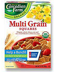 Cascadian Farm. Most of Cascadian Farms’ cereals are certified organic. Hearty Morning is comprised of flakes, short fiber segments, and oat clusters. This cereal has a nice crunchiness and a good blend of textures, but the flavor is undistinguished and has a salty aftertaste. Clifford Crunch is aimed at kids, of course, with a picture of Clifford the Big Red Dog on the box. It tastes somewhat sweeter than one would think, and the sweetness fades into an oaty-slightly salty flavor. Multi Grain Squares are light-textured, with lots of crunch. They’re less hearty than their name implies, with a blend of wheat, corn, and rice and a relatively mild taste. I munch these by the handful as a snack. Online ordering. This company is now owned by General Mills.