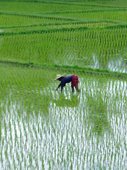 The same use of pesticides is practiced throughout the world. Some synthetic pesticides and fertilizers inadvertently poison beneficial as well as harmful animals and birds. Their residues can build up over time in the human system, when fish or animals living in the rice fields eat smaller creatures that have been sprayed, followed by humans eating those fish or animals. In many third-world countries, where rice is the staple food, women sometimes use water from flooded fields to cook with or for drinking water, further increasing opportunities for these chemicals to find their way into people’s systems. Even if the governments of these countries have regulations for working with or around agrochemicals, farmers don’t have the money to purchase proper equipment and clothing, so these insecticides, herbicides, etc. are often applied by hand, without protection for the farmer. Photo by Mee Lin Woon | IST.
