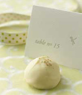 Start off your wedding feast by enticing guests with a edible eye candy: a jumbo key lime white chocolate truffle from Chocolat Cèleste. Or, pick another color to match your decor, or a flavor to match your palate: there are 16 including chai, champagne, dulce de leche, Irish crème, and pear cognac. Send revelers home with another to enjoy tomorrow. Read our full review.