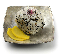 Some can be wrapped in nori or decorated with shredded nori, as in the photo of the ume rice ball, shown with two slices of pickled radish (takuwan).