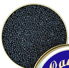 A new, farm-raised American caviar from a sturgeon cross-breeding of a female Beluga (Huso huso) and a male Sterlet (Acipenser ruthenus) from the Caspian Sea. This caviar is said to look and taste very similar to Beluga. The eggs are medium size and range in color from light gray to black; the taste is said to be wonderfully delicate. If this is true, at $70 an ounce it’s a great caviar bargain, as Beluga is unavailable at any price in the U.S. (and would probably be three times that price if it were).