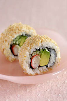 Some chefs decorate the outside rice rice with red tobiko, flying fish roe; some use sesame seeds; most leave it plain. For Christmas, you can alternate with red and green fish roes. Other variations include substituting carrot or spinach for the cucumber. After you master the basics, you can be as creative as you like—as long as you keep the avocado and the crab or fish cake.