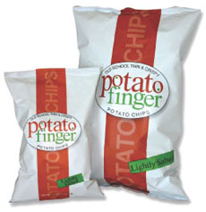 CAPSULE REPORT: PotatoFinger Potato Chips are crisp, light chips made from chipper potatoes (smaller and rounder than baking potatoes, with less starch and lower sugar) using an old family recipe. The entire line is kosher and available in four varieties: Barbecue, Lightly Salted, Salt & Vinegar and Sour Cream & Onion. Marketed as “chips with an attitude” in their retro-style packaging, they have no hydrogenated oils or trans fats. That means less grease and salt than other mainstream chip brands, and along with the quality potatoes and small-batch production, puts them in the “gourmet chip” category.