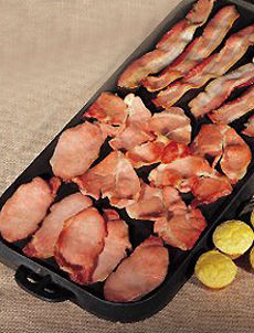 Canadian bacon, or back bacon, is lean back meat that comes from the loin section in the top center of the pig. American bacon comes from the fatty belly of the pig (see chart above). Canadian bacon is cured, but unlike conventional American Bacon, it is not smoked. Because it is cut from the loin, which is the pig’s back, it is also called back bacon. In Canada, it is simply called “bacon,” or “back bacon.” While Canadian bacon doesn’t have the smoky flavor of American bacon, it’s a way to enjoy bacon with relatively less fat. The photo at right compares Canadian bacon, on the bottom, with the fat-streaked American bacon at the top. And by the way, in Canada and the U.K., American bacon is called “streaky bacon” because of the long veins of fat that run through the meat.