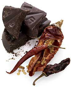 Chile and Cocoa. The is popular flavor combination of ancient Mesoamerica is resurrected in an expanded context. The Mayas and Aztecs, who were the original cultivators of cacao tree that provides us with cocoa and chocolate, only knew cacao in its beverage form. They flavored their tepid cocoa beverage with chiles and other spices (it didn’t become hot cocoa until it was brought back to Spain by the Conquistadors).