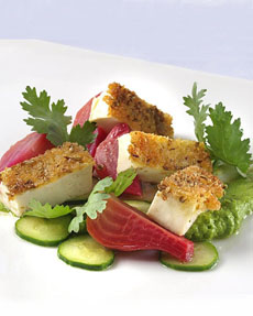 To plate: Place tofu pieces crust-side-down and cut into 5 equal-sized pieces. On a plate, smear a couple tablespoons of the avocado purée in an arc. Make an artistic arrangement of the beets and cucumbers, then place the tofu pieces on top. Dress entire dish with kabosu vinaigrette and garnish with cilantro leaves.